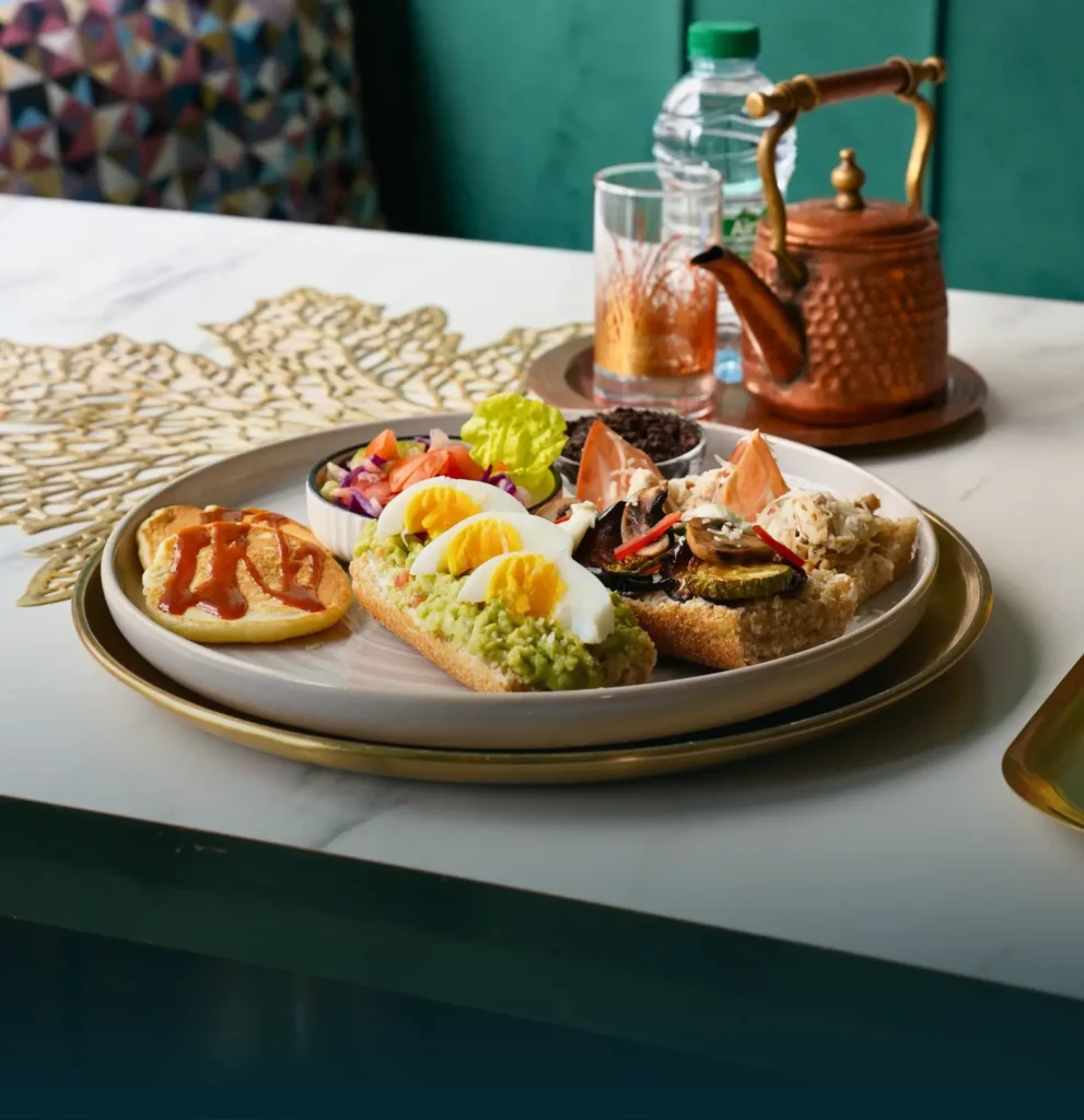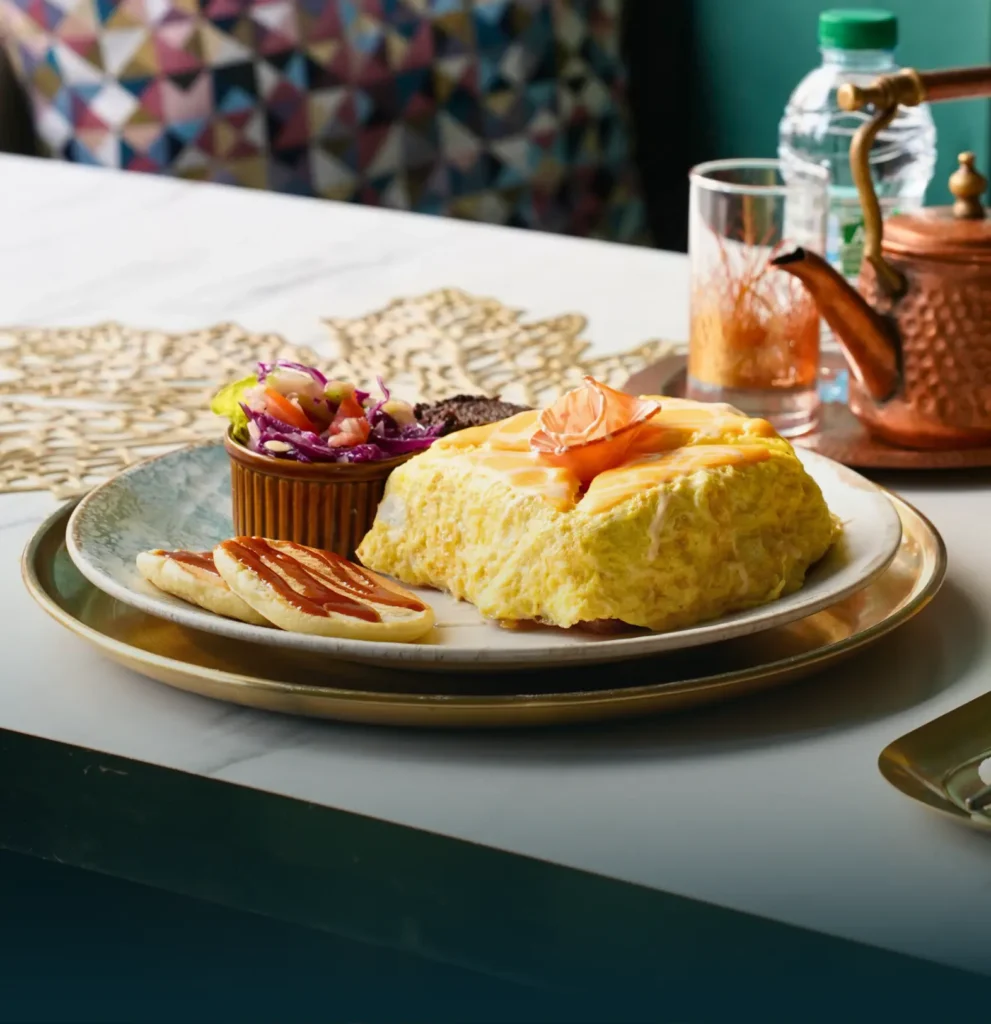 Bun tremper à l’œuf frit, guacamole, œuf brouillé, saumon, olive, Pancake, salade, jus, boisson chaude