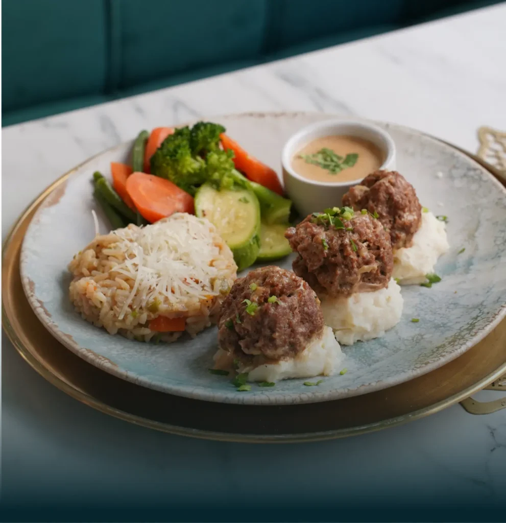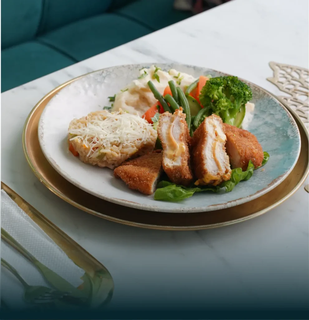 Poulet farci au cheddar et jambon fumé, le tout pané et frit, servi avec du riz, de la purée de pomme de terre et légumes sautés