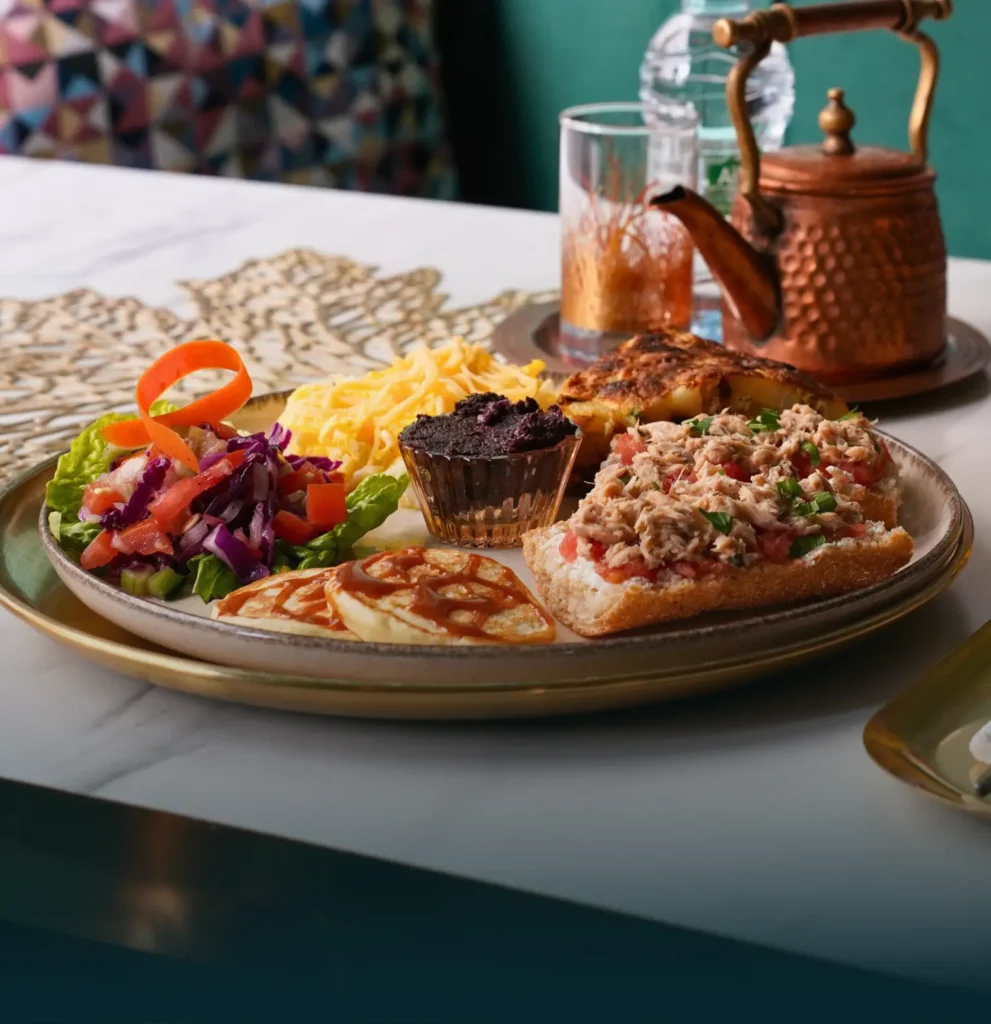 Tortilla, tartine au thon et tomates fraîche, omelette, olive, Pancake, salade, jus, boisson chaude