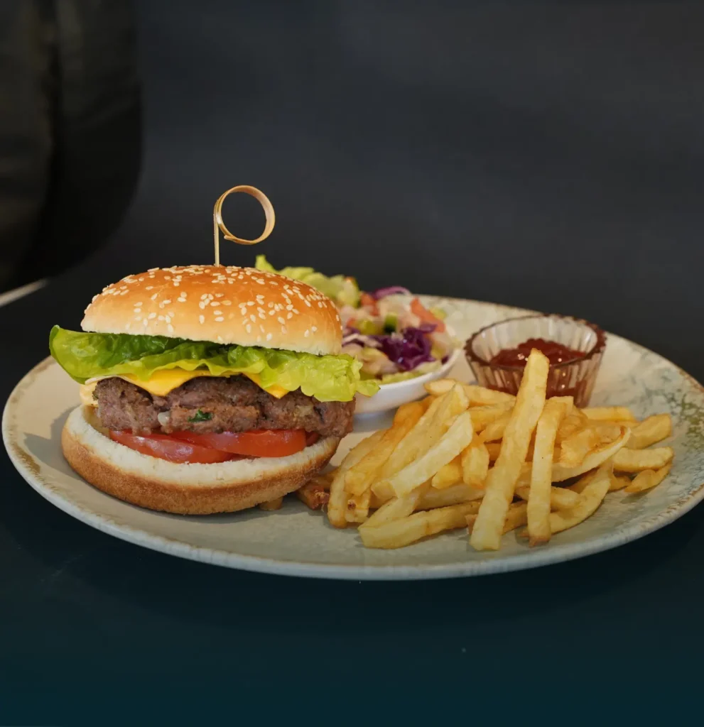 Bun, viande hachée, cheddar, cornichon, tomate, oignon, salade